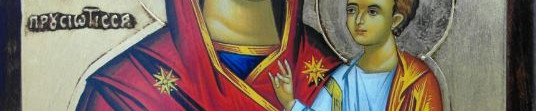 Εικόνα ξύλινη σε χρυσοτυπία με ανάγλυφα γράμματα με την Φοβερά Προστασία...